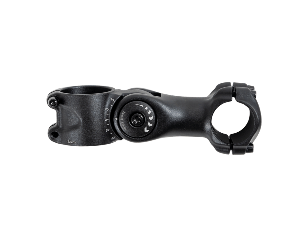 Adjustable 1.5″ stem – 110 mm length. 31.8 mm clamp. Available in Black or silver.